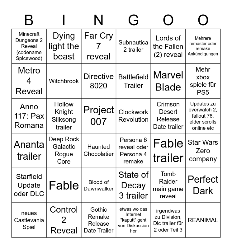 This bingo card has 36 words: State of Decay 3 trailer, Blood of Dawnwalker, etwas wo das Internet "kaputt" geht von Diskussion her, Metro 4 Reveal, Ananta trailer, Clockwork Revolution, Witchbrook, Gothic Remake Release Date Trailer, Lords of the Fallen (2) reveal, Tomb Raider main game reveal, Mehr xbox spiele für PS5, Subnautica 2 trailer, Perfect Dark, Hollow Knight Silksong trailer, Battlefield Trailer, Minecraft Dungeons 2 Reveal (codename Spicewood), Starfield Update oder DLC, Crimson Desert Release Date trailer, Anno 117: Pax Romana, Far Cry 7 reveal, Project 007, Deep Rock Galactic Rogue Core, Persona 6 reveal oder Persona 4 remake, Haunted Chocolatier, Fable trailer, Dying light the beast, Marvel Blade, Control 2 Reveal, Directive 8020, Mehrere remaster oder remake Ankündigungen, REANIMAL, neues Castlevania Spiel, Star Wars Zero company, Updates zu overwatch 2, fallout 76, elder scrolls online etc, Fable and irgendwas zu Division, Dlc trailer für 2 oder Teil 3.