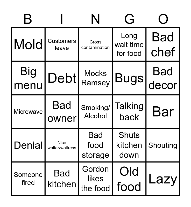 This bingo card has 25 words: Denial, Bad kitchen, Smoking/ Alcohol, Old food, Bad chef, Mold, Customers leave, Cross contamination, Talking back, Shouting, Big menu, Debt, Gordon likes the food, Shuts kitchen down, Bad decor, Someone fired, Bad owner, Mocks Ramsey, Bugs, Bar, Microwave, Nice waiter/waitress, Bad food storage, Long wait time for food and Lazy.