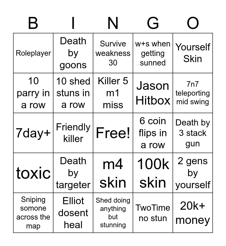 This bingo card has a free space and 24 words: Death by targeter, Elliot dosent heal, Killer 5 m1 miss, Sniping somone across the map, Yourself Skin, Roleplayer, 10 parry in a row, Death by goons, 6 coin flips in a row, m4 skin, Jason Hitbox, 7day+, 100k skin, 2 gens by yourself, 10 shed stuns in a row, TwoTime no stun, Death by 3 stack gun, Survive weakness 30, 7n7 teleporting mid swing, Friendly killer, 20k+ money, toxic, w+s when getting sunned and Shed doing anything but stunning.