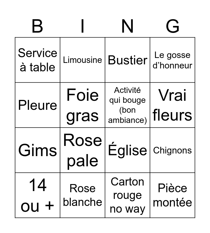 This bingo card has 16 words: Rose blanche, Chignons, Bustier, Service à table, Gims, Limousine, Église, Carton rouge no way, Pleure, Foie gras, 14 ou +, Le gosse d’honneur, Rose pale, Vrai fleurs, Activité qui bouge (bon ambiance) and Pièce montée.