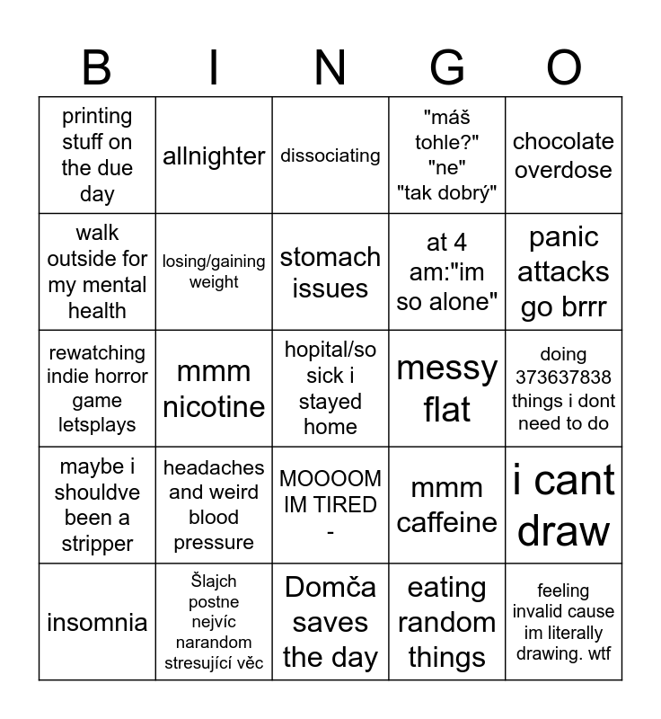 This bingo card has a free space and 24 words: insomnia, headaches and weird blood pressure, stomach issues, eating random things, chocolate overdose, printing stuff on the due day, allnighter, dissociating, messy flat, doing 373637838 things i dont need to do, rewatching indie horror game letsplays, losing/gaining weight, mmm caffeine, i cant draw, walk outside for my mental health, Šlajch postne nejvíc narandom stresující věc, Domča saves the day, "máš tohle?" "ne" "tak dobrý", panic attacks go brrr, maybe i shouldve been a stripper, mmm nicotine, MOOOOM IM TIRED -, at 4 am:"im so alone" and feeling invalid cause im literally drawing. wtf.