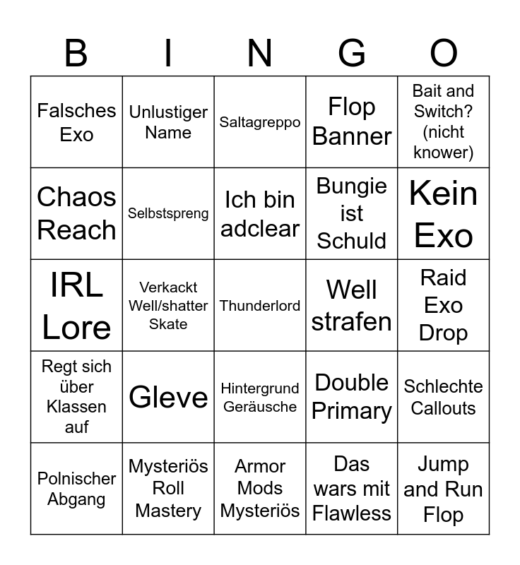 This bingo card has a free space and 24 words: Gleve, Mysteriös Roll Mastery, Ich bin adclear, Polnischer Abgang, Bait and Switch?(nicht knower), Falsches Exo, Chaos Reach, Unlustiger Name, Well strafen, Hintergrund Geräusche, Bungie ist Schuld, IRL Lore, Double Primary, Schlechte Callouts, Selbstspreng, Das wars mit Flawless, Raid Exo Drop, Saltagreppo, Kein Exo, Verkackt Well/shatter Skate, Jump and Run Flop, Regt sich über Klassen auf, Flop Banner and Armor Mods Mysteriös.