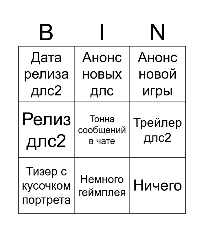 This bingo card has a free space and 8 words: Трейлер длс2, Анонс новой игры, Анонс новых длс, Тизер с кусочком портрета, Дата релиза длс2, Ничего, Релиз длс2 and Немного геймплея.
