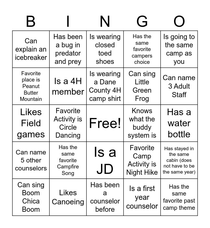 This bingo card has a free space and 24 words: Has the same favorite Campfire Song, Likes Canoeing, Is wearing a Dane County 4H camp shirt, Can sing Boom Chica Boom, Is going to the same camp as you, Can explain an icebreaker, Favorite place is Peanut Butter Mountain, Has been a bug in predator and prey, Knows what the buddy system is, Is a JD, Can sing Little Green Frog, Likes Field games, Favorite Camp Activity is Night Hike, Has stayed in the same cabin (does not have to be the same year), Is a 4H member, Is a first year counselor, Has a water bottle, Is wearing closed toed shoes, Can name 3 Adult Staff, Favorite Activity is Circle Dancing, Has the same favorite past camp theme, Can name 5 other counselors, Has the same favorite campers choice and Has been a counselor before.