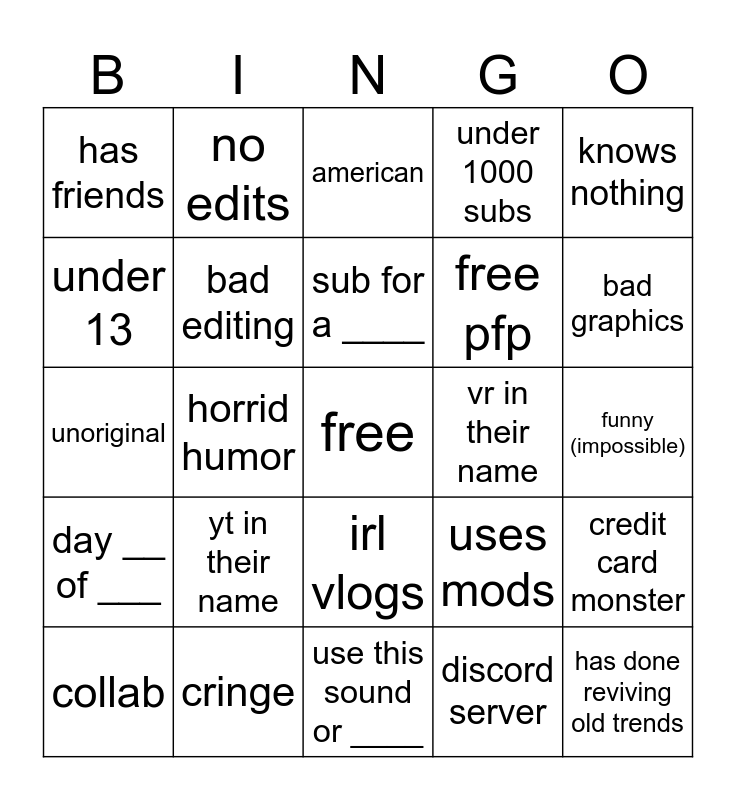 This bingo card has a free space and 24 words: yt in their name, cringe, sub for a ____, collab, knows nothing, has friends, under 13, no edits, vr in their name, irl vlogs, free pfp, unoriginal, uses mods, credit card monster, bad editing, discord server, funny (impossible), american, bad graphics, horrid humor, has done reviving old trends, day __ of ___, under 1000 subs and use this sound or ____.