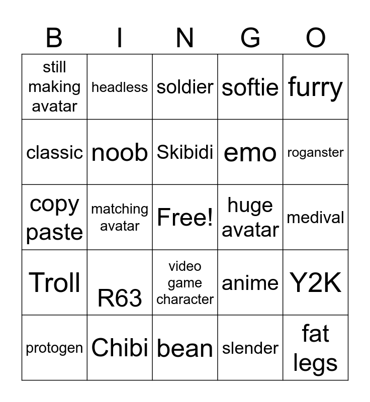 This bingo card has a free space and 24 words: R63, Chibi, Skibidi, protogen, furry, still making avatar, classic, headless, huge avatar, video game character, emo, copy paste, anime, Y2K, noob, slender, medival, soldier, roganster, matching avatar, fat legs, Troll, softie and bean.