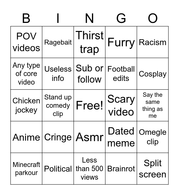 This bingo card has a free space and 24 words: Minecraft parkour, Cringe, Sub or follow, Brainrot, Racism, POV videos, Ragebait, Thirst trap, Scary video, Say the same thing as me, Chicken jockey, Useless info, Dated meme, Omegle clip, Any type of core video, Political, Less than 500 views, Furry, Cosplay, Anime, Stand up comedy clip, Asmr, Football edits and Split screen.