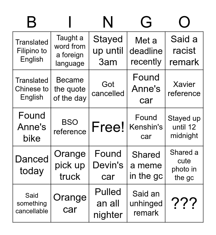 This bingo card has a free space and 24 words: Orange pick up truck, Orange car, Got cancelled, Said something cancellable, Said a racist remark, Translated Filipino to English, Translated Chinese to English, Taught a word from a foreign language, Found Kenshin's car, Found Devin's car, Found Anne's car, Found Anne's bike, Shared a meme in the gc, Shared a cute photo in the gc, Became the quote of the day, Said an unhinged remark, Stayed up until 12 midnight, Stayed up until 3am, Xavier reference, BSO reference, ???, Danced today, Met a deadline recently and Pulled an all nighter.