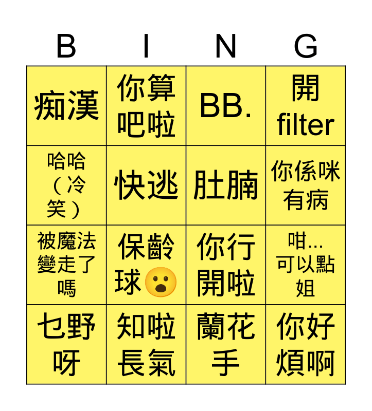 This bingo card has 16 words: 知啦 長氣, 咁... 可以點姐, BB., 痴漢, 被魔法變走了嗎, 你算吧啦, 你行開啦, 蘭花手, 哈哈 (冷笑), 快逃, 乜野呀, 開filter, 保齡球😮, 你係咪有病, 肚腩 and 你好煩啊.