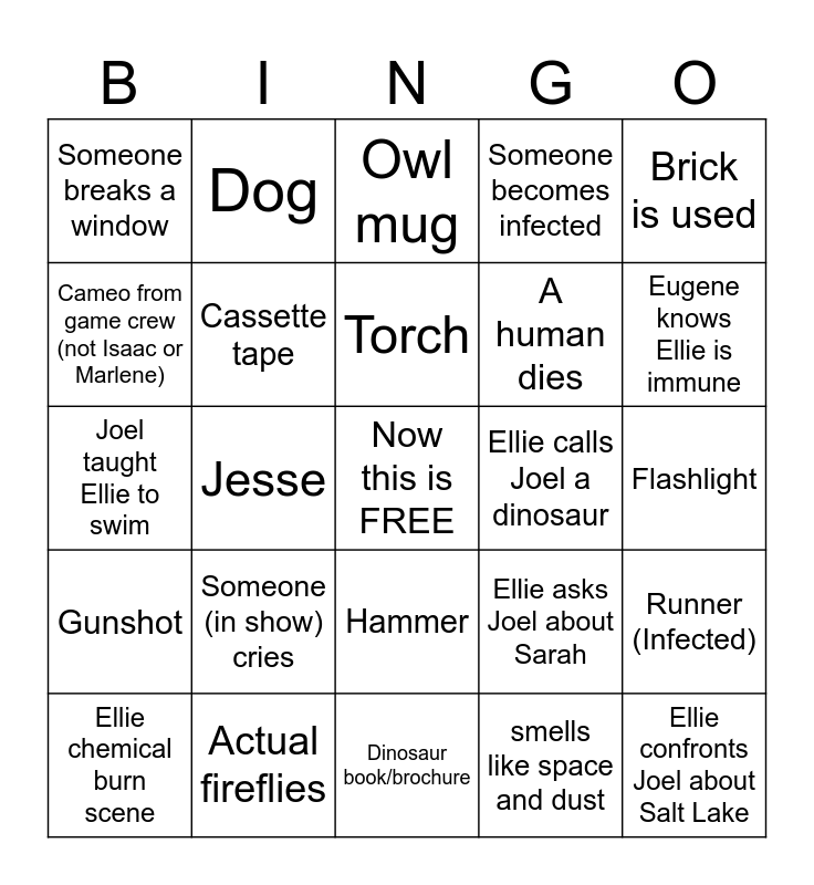 This bingo card has a free space and 66 words: Graffiti, Real-life company logo/name, Infected, Runner (Infected), Clicker, Coffee reference, Dog, Shimmer, Torch, Molly, Hammer, Wrench, Flashlight, Brick is used, Radio or walkie talkie, Cameo from game crew (not Isaac or Marlene), Jesse, Someone breaks a window, Someone turns on power / lights, A human dies, Someone (in show) cries, Gunshot, Someone becomes infected, Flashback / Backstory, Any shot from Season 1, Ellie swears, Dad joke/pun, Curtis and Viper, Ellie confronts Joel about Salt Lake, Ellie tattooing scene, Ellie chemical burn scene, "Future Days" is played, Joel says "gee-tar" or funny way, Joel tells eating clock/time-consuming joke, Ellie asks Joel about Sarah, Actual fireflies, Hat in birthday gift scene, Joel taught Ellie to swim, smells like space and dust, "Did I do okay?", Cassette tape, Jurassic Park alluded to/mentioned, Ellie calls Joel a dinosaur, Fedora-like hat, Tape recorder/player, Joel kills Eugene, Eugene knows Ellie is immune, Eugene's pr0n, "You swore", Tommy, Maria, Gail, Eugene, Seth, Kat, "I'm on a M-F-ing dinosaur!" (Or similar), Ellie calls Joel old, Moth, Owl mug, Dinosaur book/brochure, Solar system display, Cake, Gail says "baby" in any way, Firefly logo, "Liars" and Ellie tries to guess birthday gift.
