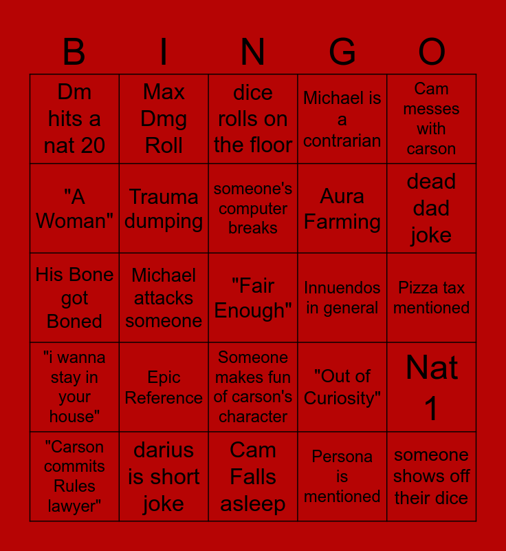 This bingo card has a free space and 25 words: Epic Reference, Cam Falls asleep, someone's computer breaks, "Carson commits Rules lawyer", Cam messes with carson, Dm hits a nat 20, "A Woman", Max Dmg Roll, Innuendos in general, Someone makes fun of carson's character, Aura Farming, His Bone got Boned, "Out of Curiosity", Nat 1, Trauma dumping, Screen goes Schizoid, Pizza tax mentioned, dice rolls on the floor, dead dad joke, Michael attacks someone, someone shows off their dice, darius is short joke, "i wanna stay in your house", Michael is a contrarian and Persona is mentioned.