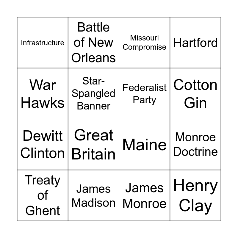 This bingo card has 19 words: Maine, War of 1812, Missouri Compromise, Henry Clay, Monroe Doctrine, War Hawks, James Monroe, Infrastructure, Battle of New Orleans, Dewitt Clinton, Great Britain, Star-Spangled Banner, Federalist Party, James Madison, Treaty of Ghent, Erie Canal, Hartford, Cotton Gin and Andrew Jackson.