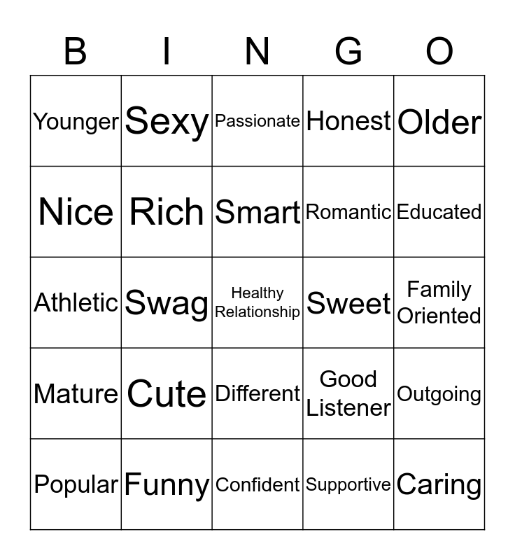 This bingo card has a free space and 24 words: Cute, Funny, Smart, Popular, Older, Younger, Nice, Sexy, Sweet, Different, Romantic, Athletic, Good Listener, Outgoing, Rich, Supportive, Family Oriented, Passionate, Educated, Swag, Caring, Mature, Honest and Confident.