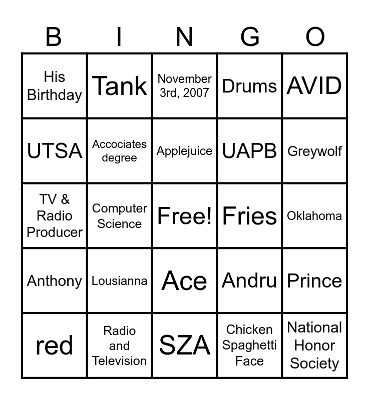 This bingo card has a free space and 36 words: 3, 4, 36/473, Accociates degree, Andru, Anthony, Applejuice, April 12th, 2007, AVID, Class of 2025, Computer Science, Drums, Floral Design, Fries, Greywolf, His Birthday, Lion, Lousianna, National Honor Society, November 3rd, 2007, Oklahoma, Prince, Radio and Television, red, SZA, Tank, TV & Radio Producer, Tyller, UAPB, UTSA, Volleyball, 60/198, Chicken Spaghetti Face, Ace, Doody and 2.