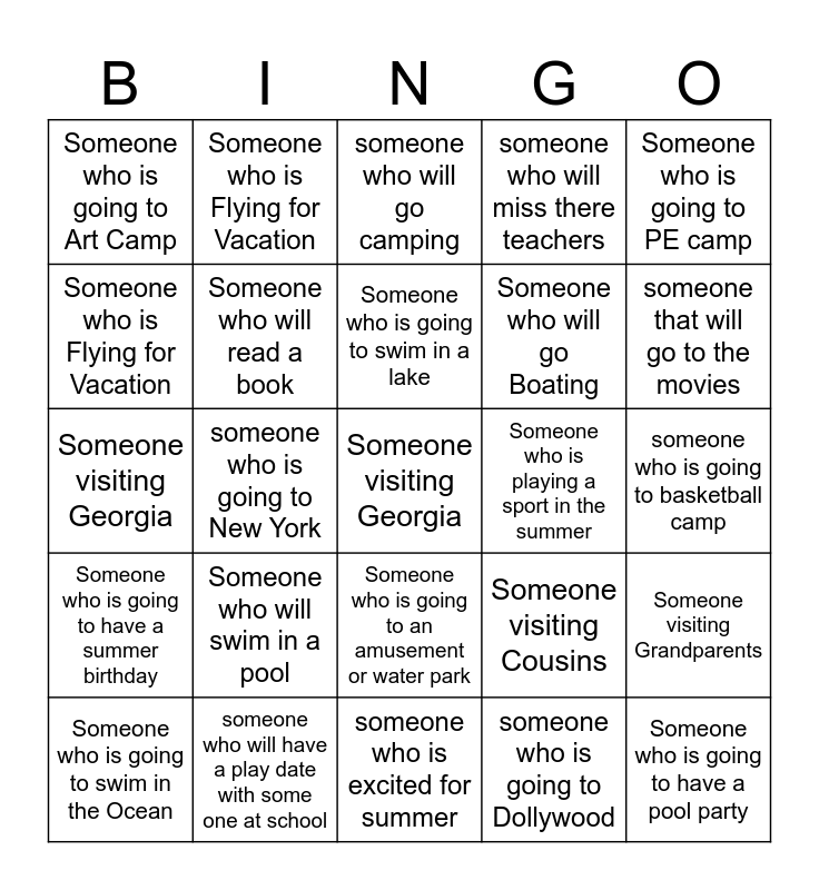 This bingo card has a free space and 24 words: Someone who will swim in a pool, someone who will have a play date with some one at school, Someone who is going to swim in a lake, Someone who is going to swim in the Ocean, Someone who is going to PE camp, Someone who is going to Art Camp, Someone who is Flying for Vacation, Someone who is Flying for Vacation, Someone who is playing a sport in the summer, Someone who is going to an amusement or water park, Someone who will go Boating, Someone visiting Georgia, Someone visiting Cousins, Someone visiting Grandparents, Someone who will read a book, someone who is going to Dollywood, someone who is going to basketball camp, someone who will go camping, someone that will go to the movies, someone who is going to New York, Someone who is going to have a pool party, Someone who is going to have a summer birthday, someone who will miss there teachers and someone who is excited for summer.
