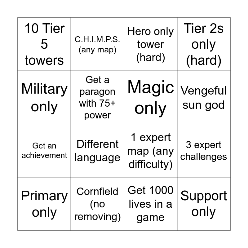 This bingo card has 16 words: Cornfield (no removing), 3 expert challenges, Hero only tower (hard), 10 Tier 5 towers, Get an achievement, C.H.I.M.P.S. (any map), 1 expert map (any difficulty), Get 1000 lives in a game, Military only, Get a paragon with 75+ power, Primary only, Tier 2s only (hard), Different language, Vengeful sun god, Magic only and Support only.