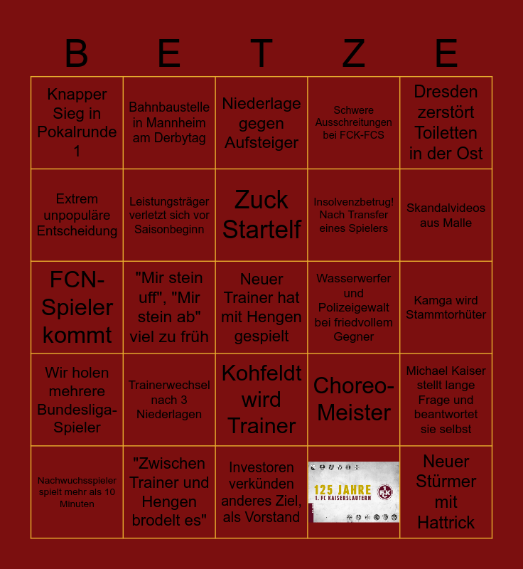 This bingo card has 1 images, a free space and 24 words: Trainerwechsel nach 3 Niederlagen, Investoren verkünden anderes Ziel, als Vorstand, Zuck Startelf, Nachwuchsspieler spielt mehr als 10 Minuten, Dresden zerstört Toiletten in der Ost, Knapper Sieg in Pokalrunde 1, Extrem unpopuläre Entscheidung, Bahnbaustelle in Mannheim am Derbytag, Wasserwerfer und Polizeigewalt bei friedvollem Gegner, Kohfeldt wird Trainer, Insolvenzbetrug! Nach Transfer eines Spielers, FCN-Spieler kommt, Choreo-Meister, Michael Kaiser stellt lange Frage und beantwortet sie selbst, Leistungsträger verletzt sich vor Saisonbeginn, Hengen ruft Aufstieg aus, Kamga wird Stammtorhüter, Niederlage gegen Aufsteiger, Skandalvideos aus Malle, "Mir stein uff", "Mir stein ab" viel zu früh, Neuer Stürmer mit Hattrick, "Zwischen Trainer und Hengen brodelt es", Wir holen mehrere Bundesliga-Spieler and Schwere Ausschreitungen bei FCK-FCS.