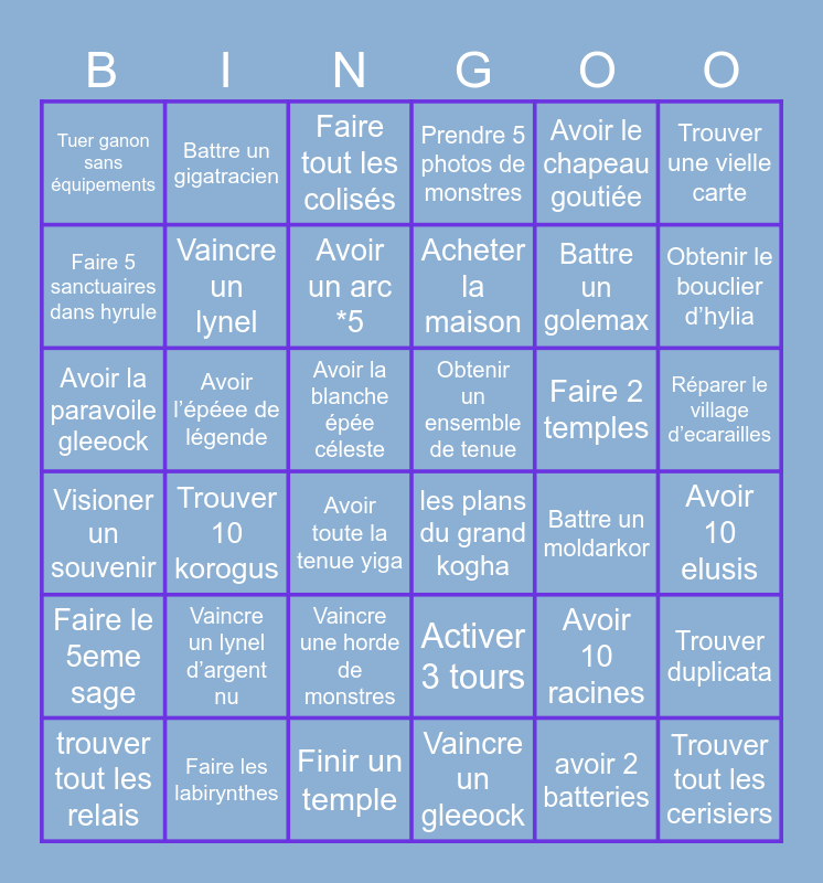 This bingo card has 36 words: Activer 3 tours, Vaincre une horde de monstres, Vaincre un gleeock, Faire 5 sanctuaires dans hyrule, Visioner un souvenir, Obtenir un ensemble de tenue, Vaincre un lynel, Finir un temple, Avoir le chapeau goutiée, Avoir 10 racines, Obtenir le bouclier d’hylia, Prendre 5 photos de monstres, Trouver duplicata, Avoir l’épéee de légende, Acheter la maison, Tuer ganon sans équipements, Faire le 5eme sage, Faire 2 temples, Avoir la paravoile gleeock, Faire tout les colisés, Avoir la blanche épée céleste, Trouver 10 korogus, les plans du grand kogha, Avoir toute la tenue yiga, Battre un moldarkor, Battre un gigatracien, Battre un golemax, Faire les labirynthes, Avoir un arc *5, Trouver une vielle carte, Trouver tout les cerisiers, trouver tout les relais, Avoir 10 elusis, Réparer le village d’ecarailles, Vaincre un lynel d’argent nu and avoir 2 batteries.