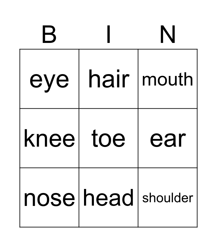 This bingo card has 13 words: leg, arm, nose, hair, knee, toe, shoulder, finger, head, eye, ear, mouth and teeth.