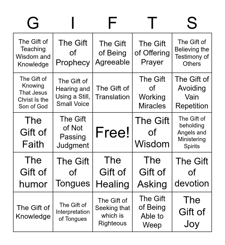 This bingo card has a free space and 24 words: The Gift of Tongues, The Gift of Interpretation of Tongues, The Gift of Translation, The Gift of Knowledge, The Gift of Believing the Testimony of Others, The Gift of Teaching Wisdom and Knowledge, The Gift of Knowing That Jesus Christ Is the Son of God, The Gift of Prophecy, The Gift of Wisdom, The Gift of Healing, The Gift of Working Miracles, The Gift of Faith, The Gift of Asking, The Gift of devotion, The Gift of Hearing and Using a Still, Small Voice, The Gift of Being Able to Weep, The Gift of beholding Angels and Ministering Spirits, The Gift of Being Agreeable, The Gift of Avoiding Vain Repetition, The Gift of Not Passing Judgment, The Gift of Joy, The Gift of humor, The Gift of Offering Prayer and The Gift of Seeking that which is Righteous.