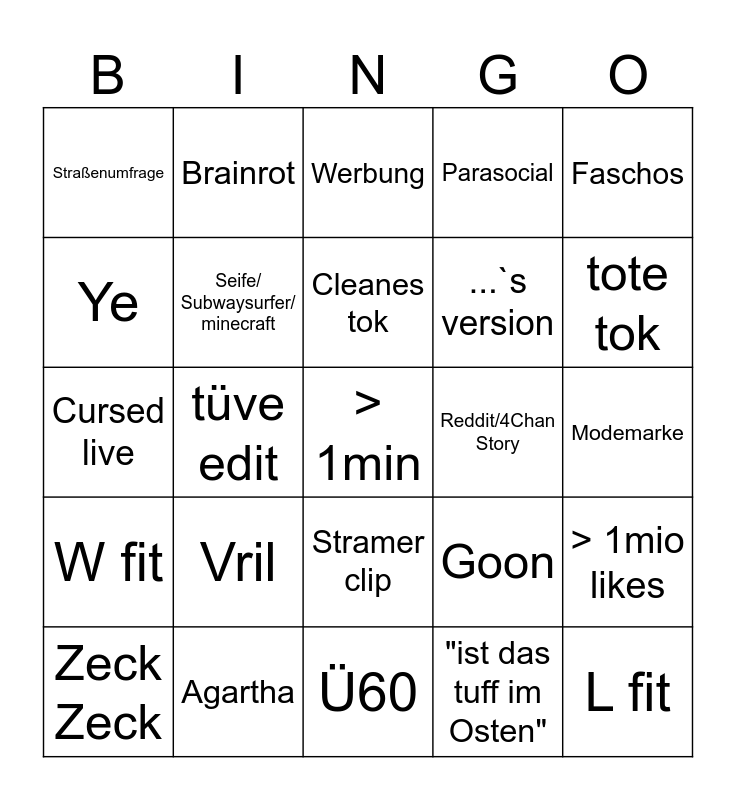This bingo card has a free space and 24 words: Vril, Agartha, Cleanes tok, Zeck Zeck, Faschos, Straßenumfrage, Ye, Brainrot, Reddit/4Chan Story, Stramer clip, ...`s version, Cursed live, Goon, > 1mio likes, Seife/ Subwaysurfer/ minecraft, "ist das tuff im Osten", Modemarke, Werbung, tote tok, tüve edit, L fit, W fit, Parasocial and Ü60.