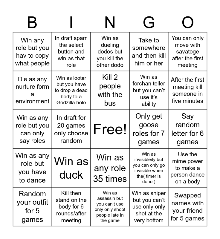 This bingo card has a free space and 24 words: Win as duck, Kill then stand on the body for 6 rounds/after meeting, Kill 2 people with the bus, Random your outfit for 5 games, You can only move with savatoge after the first meeting, Win any role but you hav to copy what people, Die as any nurture form a environment, In draft spam the select button and win as that role, Only get goose roles for 7 games, Win as any role 35 times, Win as forchan teller but you can’t use it’s ability, Win as any role but you can only say roles, Win as invisibleity but you can only go invisible when the( timer is done ), Use the mime power to make a person dance on a body, Win as looter but you have to drop a dead body to a Godzilla hole, Win as sniper but you can’t use only only shot at the very bottom, Say random letter for 6 games, Win as dueling dodos but you kill the other dodo, After the first meeting kill someone in five minutes, In draft for 20 games only choose random, Swapped names with your friend for 5 games, Win as any role but you have to dance, Take to somewhere and then kill him or her and Win as assassin but you can’t use only only shoot people late in the game.