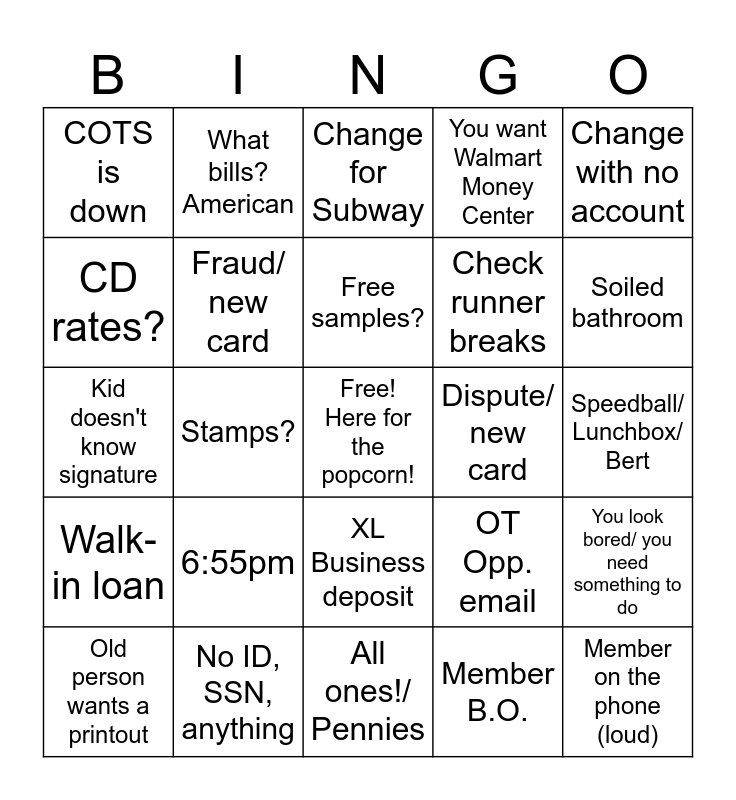 This bingo card has a free space and 39 words: Where are the boys/ girls?, It's so nice out, Has it been busy?, Fraud/ new card, Old person wants a printout, XL Business deposit, Free samples?, I'm a member!, Change with no account, Walk-in loan, Stamps?, You want Walmart Money Center, Member on the phone (loud), Speedball/ Lunchbox/ Bert, Dispute/ new card, 6:55pm, Recycler Jam, COTS is down, Phone help needed, OT Opp. email, CD rates?, All ones!/ Pennies, Check runner breaks, Soiled bathroom, Motorized scooter accident, Member wants desk, Asks for Manager (something dumb), Money Order??, Coin counter?/ unrolled coin, What bills? American, I don't care what bills - does want specific bills, Can I get my yellow slip?, Change for Subway, No ID, SSN, anything, Member B.O., Who wants me??, You look bored/ you need something to do, Kid doesn't know signature and Scanner beeps/ alarms.