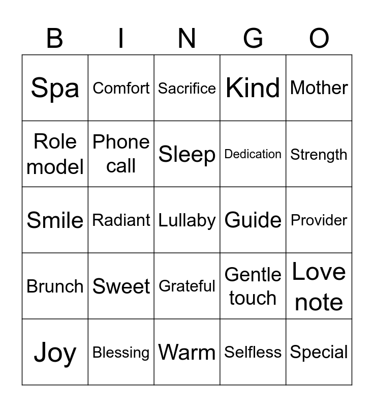 This bingo card has 101 words: Free!, Mom, Mother, Mommy, Mama, Mummy, Love, Hug, Kiss, Gift, Flowers, Tulip, Rose, Daisy, Card, Breakfast, Brunch, Dinner, Family, Children, Daughter, Son, Care, Support, Patience, Strength, Kind, Sweet, Beautiful, Home, Comfort, Sacrifice, Nurture, Devotion, Thank you, Grateful, Memories, Gentle, Selfless, Warm, Smiles, Joy, Celebration, Heart, Handmade, Lullaby, Stories, Bedtime, Cuddle, Special, Queen, Role model, Teaching, Cooking, Baking, Laundry, Clean, Organize, Grocery, Errands, Phone call, Surprise, Proud, Caring, Strong, Dedication, Generous, Radiant, Blessing, Honor, Pamper, Nails, Spa, Relax, Sleep, Smile, Laughter, Empathy, Encouragement, Wisdom, Grace, Beauty, Guide, Hero, Guardian, Protector, Provider, Mentor, Faith, Trust, Gentle touch, Singing, Recipe, Apron, Shopping, Love note, Scent, Jewelry, Balloon, Celebration and Legacy.