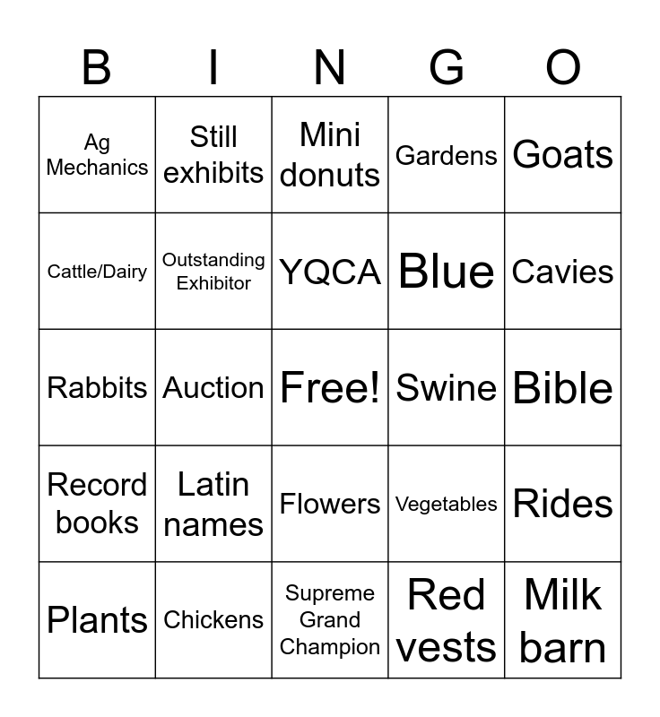 This bingo card has a free space and 24 words: Plants, Latin names, YQCA, Red vests, Goats, Ag Mechanics, Still exhibits, Mini donuts, Swine, Bible, Rabbits, Outstanding Exhibitor, Vegetables, Rides, Cattle/Dairy, Chickens, Supreme Grand Champion, Gardens, Cavies, Record books, Auction, Flowers, Blue and Milk barn.
