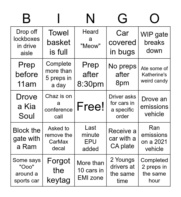 This bingo card has a free space and 34 words: Chaz says "Hello" with a British accent, 2 Youngs drivers at the same time, Complete your WorkDay Learning, Printer breaks down, Block the gate with a Ram, Complete more than 5 preps in a day, WIP gate breaks down, Some says "Ooo" around a sports car, Towel basket is full, Asked to resecure a vehicle, Prep after 8:30pm, Heard a "Meow", John gave you a movie recommend-ation, Ran out of locators, Driver asks for cars in a specific order, Ate some of Katherine's weird candy, Forgot the keytag, Drove a Kia Soul, Asked to remove the CarMax decal, Receive a car with a CA plate, Last minute EPU added, Someone saved a new fortune from Panda, Drop off lockboxes in drive aisle, Drove an emissions vehicle, More than 10 cars in EMI zone, Completed 2 preps in the same hour, Car covered in bugs, Received a Camry, No preps after 8pm, Prep before 11am, Drove a CX-5, Chaz is on a conference call, Ran emissions on a 2021 vehicle and Forget to untether prep keys.