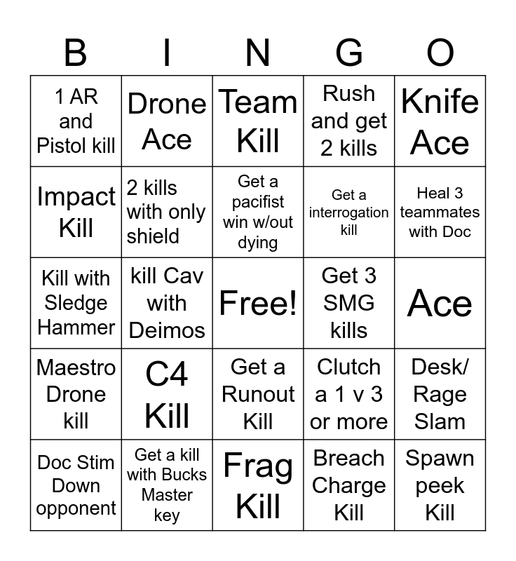 This bingo card has a free space and 24 words: C4 Kill, Get a kill with Bucks Master key, Get a pacifist win w/out dying, Doc Stim Down opponent, Knife Ace, 1 AR and Pistol kill, Impact Kill, Drone Ace, Get 3 SMG kills, Get a Runout Kill, Get a interrogation kill, Kill with Sledge Hammer, Clutch a 1 v 3 or more, Desk/ Rage Slam, 2 kills with only shield, Breach Charge Kill, Ace, Team Kill, Heal 3 teammates with Doc, kill Cav with Deimos, Spawn peek Kill, Maestro Drone kill, Rush and get 2 kills and Frag Kill.