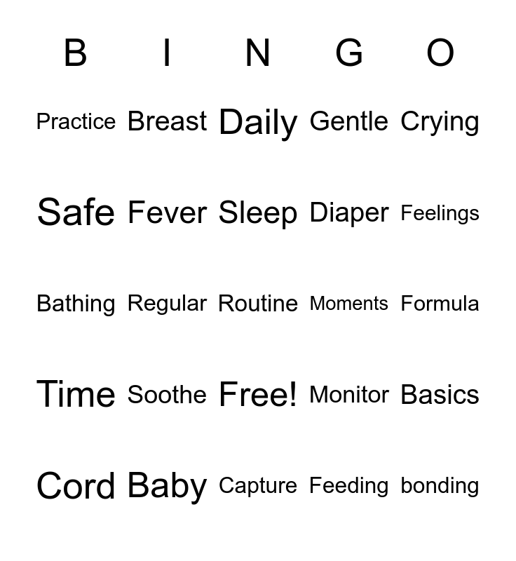 This bingo card has 26 words: Free!, Feeding, Sleep, Baby, Crying, Practice, Safe, Breast, Formula, Monitor, Diaper, Bathing, Basics, Cord, Regular, Doctor, Gentle, Time, Daily, Routine, Feelings, Capture, Moments, Soothe, Fever and bonding.