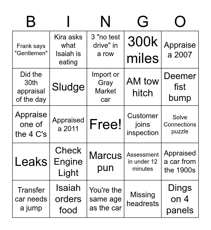 This bingo card has a free space and 34 words: Found Frame, Missing headrests, Clamp Marks, Maggie told you to put it in WorkDay, Leaks, Sludge, Appraise a 2007, Transfer car needs a jump, Kira asks what Isaiah is eating, Help with Sales Secure, Import or Gray Market car, 3 "no test drive" in a row, Sales asks about offer value, Lifted, Customer joins inspection, Deemer fist bump, Isaiah orders food, Appraise one of the 4 C's, Check Engine Light, Assessment in under 12 minutes, Marcus pun, Maggie has braids today, Frank says "Gentlemen", Solve Connections puzzle, You're the same age as the car, Dings on 4 panels, 300k miles, AM wheels, AM tow hitch, Did the 30th appraisal of the day, "Hey friends" from Business Office, Appraised a 2011, Appraised a car from the 1900s and I.O. needs correction.