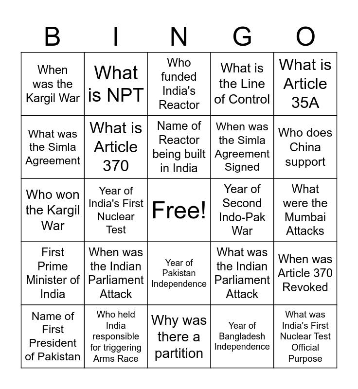 This bingo card has a free space and 32 words: Year of Bangladesh Independence, Year of India Independence, Year of India's First Nuclear Test, Name of India's First Nuclear Test, First Prime Minister of India, What is Article 370, What is Article 35A, When was Article 370 Revoked, What is NPT, India's Nuclear Policy, Name of Reactor being built in India, Who funded India's Reactor, What is Kashmir known as, Year of First Indo-Pak War, Year of Second Indo-Pak War, Name of King of Kashmir, Name of First President of Pakistan, Who won the Kargil War, Year of Pakistan Independence, When was the Indian Parliament Attack, What was the Indian Parliament Attack, When were the Mumbai Attacks, What were the Mumbai Attacks, Who held India responsible for triggering Arms Race, What was India's First Nuclear Test Official Purpose, What is the Line of Control, When was the Simla Agreement Signed, What was the Simla Agreement, When was the Kargil War, Why was there a partition, What region does China Control and Who does China support.