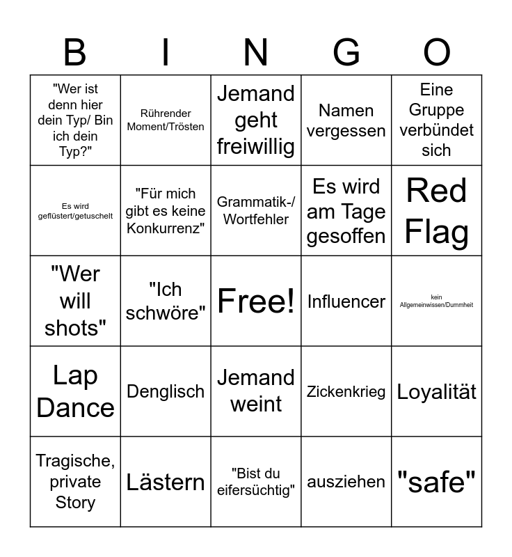 This bingo card has a free space and 25 words: Denglisch, "Bist du eifersüchtig", Grammatik-/ Wortfehler, Tragische, private Story, Eine Gruppe verbündet sich, "Wer ist denn hier dein Typ/ Bin ich dein Typ?", Es wird geflüstert/getuschelt, Rührender Moment/Trösten, Influencer, Jemand weint, Es wird am Tage gesoffen, "Wer will shots", Zickenkrieg, Loyalität, "Für mich gibt es keine Konkurrenz", Suff Story, kein Allgemeinwissen/Dummheit, Jemand geht freiwillig, Red Flag, "Ich schwöre", "safe", Lästern, Lap Dance, Namen vergessen and ausziehen.