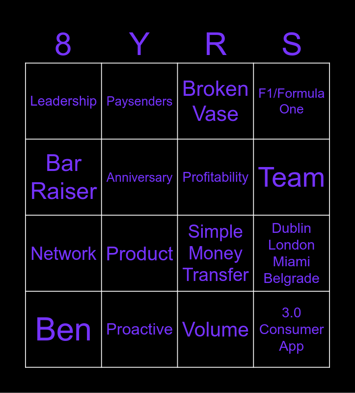 This bingo card has 16 words: Ben, Proactive, Broken Vase, F1/Formula One, Bar Raiser, Paysenders, Simple Money Transfer, Dublin London Miami Belgrade, Leadership, Anniversary, Volume, Team, Network, Product, Profitability and 3.0 Consumer App.
