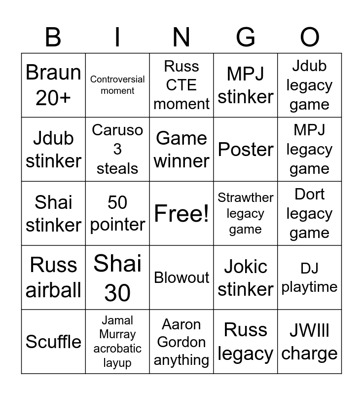 This bingo card has a free space and 24 words: Shai 30, Jamal Murray acrobatic layup, Game winner, Scuffle, Jdub legacy game, Braun 20+, Jdub stinker, Controversial moment, Strawther legacy game, Blowout, Poster, Shai stinker, Jokic stinker, DJ playtime, Caruso 3 steals, Russ legacy, Dort legacy game, Russ CTE moment, MPJ legacy game, 50 pointer, JWIll charge, Russ airball, MPJ stinker and Aaron Gordon anything.