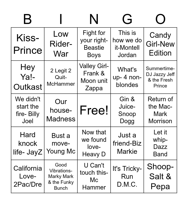 This bingo card has a free space and 43 words: Rapper's Delight Sugar Hill Gang, Shoop-Salt & Pepa, Ice Ice Baby- Vanilla Ice, California Love- 2Pac/Dre, You dropped a bomb on me- Gap Band, It's Tricky-Run D.M.C., Fight for your right-Beastie Boys, Lose Yourself-Eminem, Candy Girl-New Edition, Good Vibrations-Marky Mark & the Funky Bunch, This is how we do it-Montell Jordan, Gin & Juice- Snoop Dogg, Now that we found love- Heavy D, Bust a move-Young Mc, Walk this way-Run D.M.C. & Aerosmith, U Can't touch this- Mc Hammer, Funky Cold Medina- Tone Loc, We didn't start the fire- Billy Joel, O.P.P- Naughty By Nature, Summertime- DJ Jazzy Jeff & the Fresh Prince, Low Rider- War, Waterfalls- TLC, Party all the time-Eddie Murphy, Kiss-Prince, Fantastic Voyage- Coolio, Return of the Mac- Mark Morrison, My Lovin-En Vougue, Ironic- Alanis Morrisette, Just a friend-Biz Markie, Hard knock life- JayZ, Let's go crazy-Prince, Let it whip-Dazz Band, Motownphilly- Boyzllmen, Our house- Madness, Wanna be startin something- Michael Jackson, Rapture- Blondie, Informer-Snow, Valley Girl-Frank & Moon unit Zappa, Hey Ya!- Outkast, What's up- 4 non-blondes, Drop it like it's hot-Snoop Dogg, 2 Legit 2 Quit- McHammer and Low-Flo-rida & T Pain.