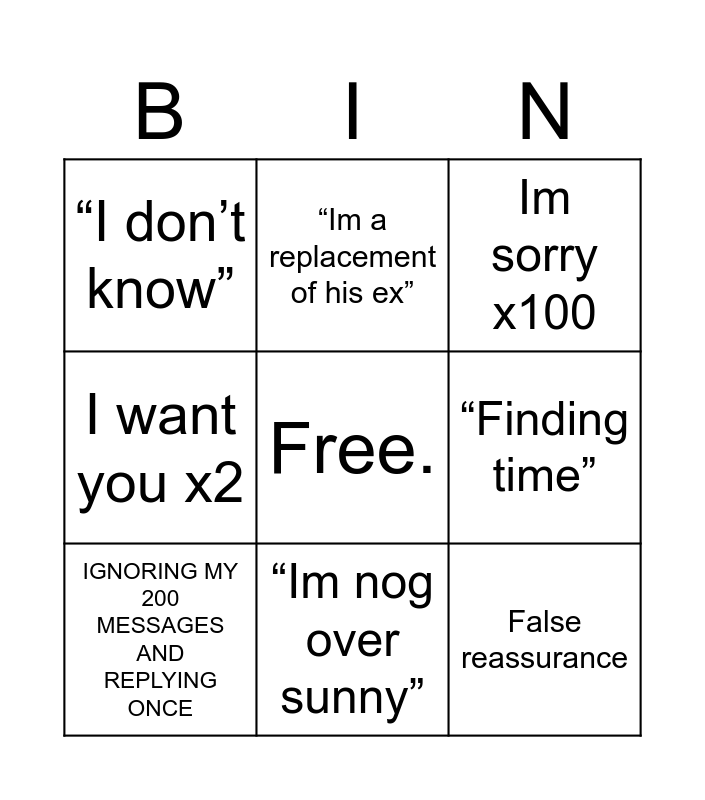 This bingo card has a free space and 8 words: “Finding time”, Im sorry x100, “Im a replacement of his ex”, IGNORING MY 200 MESSAGES AND REPLYING ONCE, “I don’t know”, False reassurance, I want you x2 and “Im nog over sunny”.