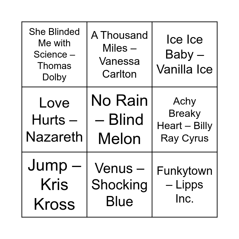 This bingo card has 20 words: More Than Words – Extreme, Take On Me – a-ha, Ice Ice Baby – Vanilla Ice, Video Killed the Radio Star – The Buggles, Who Let the Dogs Out – Baha Men, No Rain – Blind Melon, Nothing Compares 2 U – Sinéad O'Connor, She Blinded Me with Science – Thomas Dolby, Funkytown – Lipps Inc., A Thousand Miles – Vanessa Carlton, You're Beautiful – James Blunt, Lovefool – The Cardigans, Achy Breaky Heart – Billy Ray Cyrus, Whoomp! (There It Is) – Tag Team, Jump – Kris Kross, Dancing in the Moonlight – King Harvest, Venus – Shocking Blue, Love Hurts – Nazareth, Would I Lie to You? – Charles & Eddie and Shut Up and Dance – Walk the Moon.