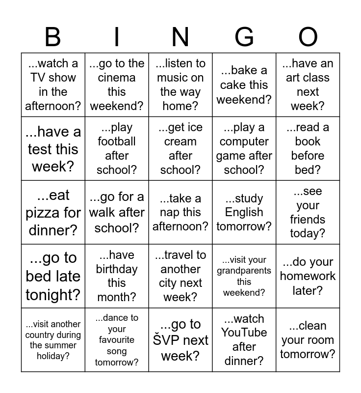 This bingo card has 25 words: ...have birthday this month?, ...go to ŠVP next week?, ...get ice cream after school?, ...visit another country during the summer holiday?, ...have an art class next week?, ...watch a TV show in the afternoon?, ...have a test this week?, ...go to the cinema this weekend?, ...study English tomorrow?, ...travel to another city next week?, ...play a computer game after school?, ...eat pizza for dinner?, ...visit your grandparents this weekend?, ...do your homework later?, ...play football after school?, ...clean your room tomorrow?, ...see your friends today?, ...listen to music on the way home?, ...read a book before bed?, ...go for a walk after school?, ...take a nap this afternoon?, ...dance to your favourite song tomorrow?, ...go to bed late tonight?, ...bake a cake this weekend? and ...watch YouTube after dinner?.