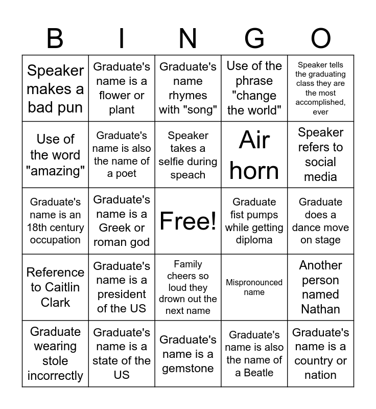 This bingo card has a free space and 24 words: Graduate's name is a president of the US, Graduate's name is a state of the US, Speaker takes a selfie during speach, Graduate wearing stole incorrectly, Speaker tells the graduating class they are the most accomplished, ever, Speaker makes a bad pun, Use of the word "amazing", Graduate's name is a flower or plant, Graduate fist pumps while getting diploma, Family cheers so loud they drown out the next name, Air horn, Graduate's name is an 18th century occupation, Mispronounced name, Another person named Nathan, Graduate's name is also the name of a poet, Graduate's name is also the name of a Beatle, Graduate does a dance move on stage, Graduate's name rhymes with "song", Speaker refers to social media, Graduate's name is a Greek or roman god, Graduate's name is a country or nation, Reference to Caitlin Clark, Use of the phrase "change the world" and Graduate's name is a gemstone.
