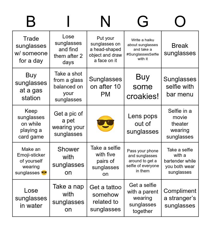 This bingo card has a free space and 24 words: Shower with sunglasses on, Take a nap with sunglasses on, Sunglasses on after 10 PM, Lose sunglasses in water, Break sunglasses, Trade sunglasses w/ someone for a day, Buy sunglasses at a gas station, Lose sunglasses and find them after 2 days, Lens pops out of sunglasses, Take a selfie with five pairs of sunglasses on, Buy some croakies!, Keep sunglasses on while playing a card game, Pass your phone and sunglasses around to get a selfie of everyone in them, Take a selfie with a bartender while you both wear sunglasses, Take a shot from a glass balanced on your sunglasses, Get a selfie with a parent wearing sunglasses together, Selfie in a movie theater wearing sunglasses, Put your sunglasses on a head-shaped object and draw a face on it, Sunglasses selfie with bar menu, Get a pic of a pet wearing your sunglasses, Compliment a stranger’s sunglasses, Make an Emoji-sticker of yourself wearing sunglasses 😎, Write a haiku about sunglasses and take a #SunglassesSelfie with it and Get a tattoo somehow related to sunglasses.