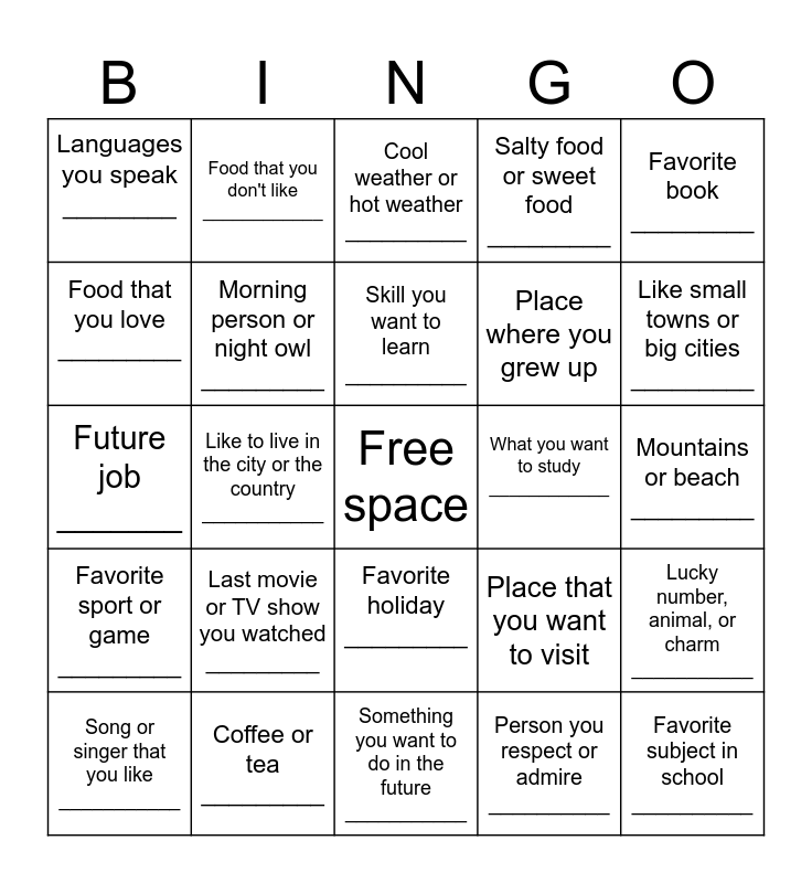 This bingo card has a free space and 24 words: Last movie or TV show you watched _________, Coffee or tea _________, Skill you want to learn __________, Song or singer that you like ___________, Favorite book _________, Languages you speak ________, Food that you love _________, Food that you don't like ____________, What you want to study ____________, Favorite holiday _________, Place where you grew up, Future job _______, Place that you want to visit, Lucky number, animal, or charm ___________, Morning person or night owl _________, Person you respect or admire __________, Mountains or beach _________, Cool weather or hot weather __________, Like small towns or big cities _________, Like to live in the city or the country ___________, Favorite subject in school __________, Favorite sport or game _________, Salty food or sweet food _________ and Something you want to do in the future ___________.