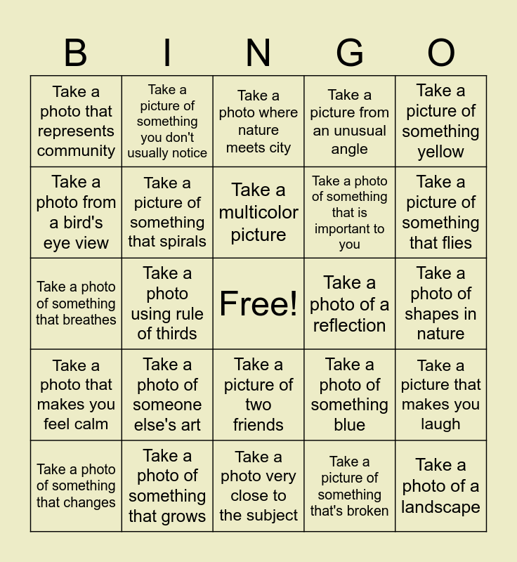 This bingo card has a free space and 24 words: Take a photo of someone else's art, Take a photo of something that grows, Take a multicolor picture, Take a photo of something that changes, Take a picture of something yellow, Take a photo that represents community, Take a photo from a bird's eye view, Take a picture of something you don't usually notice, Take a photo of a reflection, Take a picture of two friends, Take a photo of something that is important to you, Take a photo of something that breathes, Take a photo of something blue, Take a picture that makes you laugh, Take a picture of something that spirals, Take a picture of something that's broken, Take a photo of shapes in nature, Take a photo where nature meets city, Take a picture of something that flies, Take a photo using rule of thirds, Take a photo of a landscape, Take a photo that makes you feel calm, Take a picture from an unusual angle and Take a photo very close to the subject.