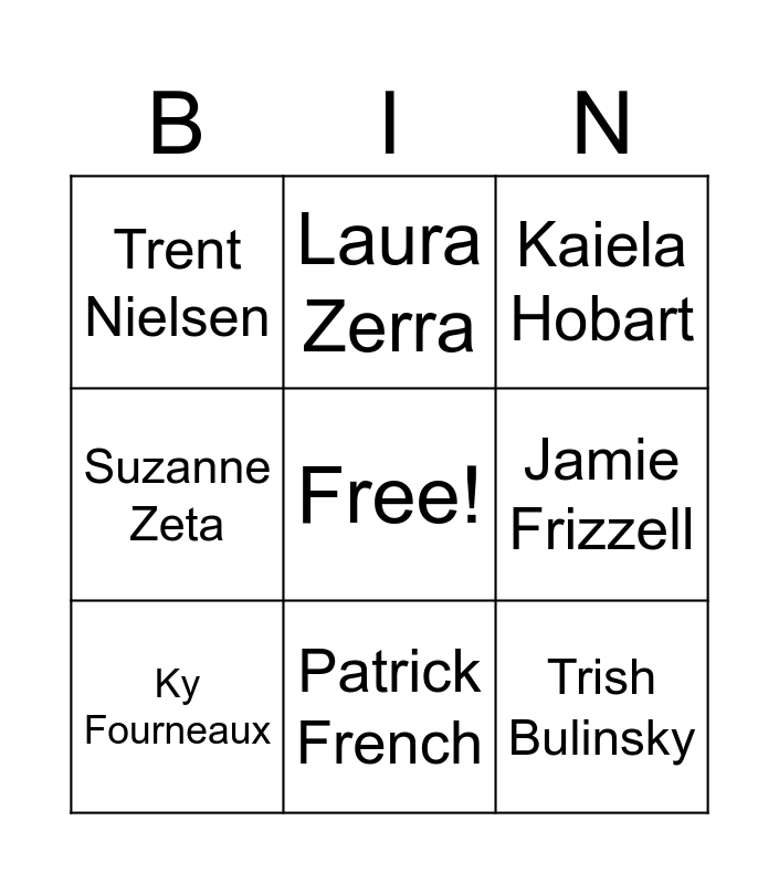 This bingo card has a free space and 14 words: Matt Wright, Max Djenohan, Ky Fourneaux, Laura Zerra, Suzanne Zeta, Trish Bulinsky, Kaila Cumings, Darrin Reay, Patrick French, Trent Nielsen, Cheney Plante, Jamie Frizzell, Kaiela Hobart and Jermaine Jackson.