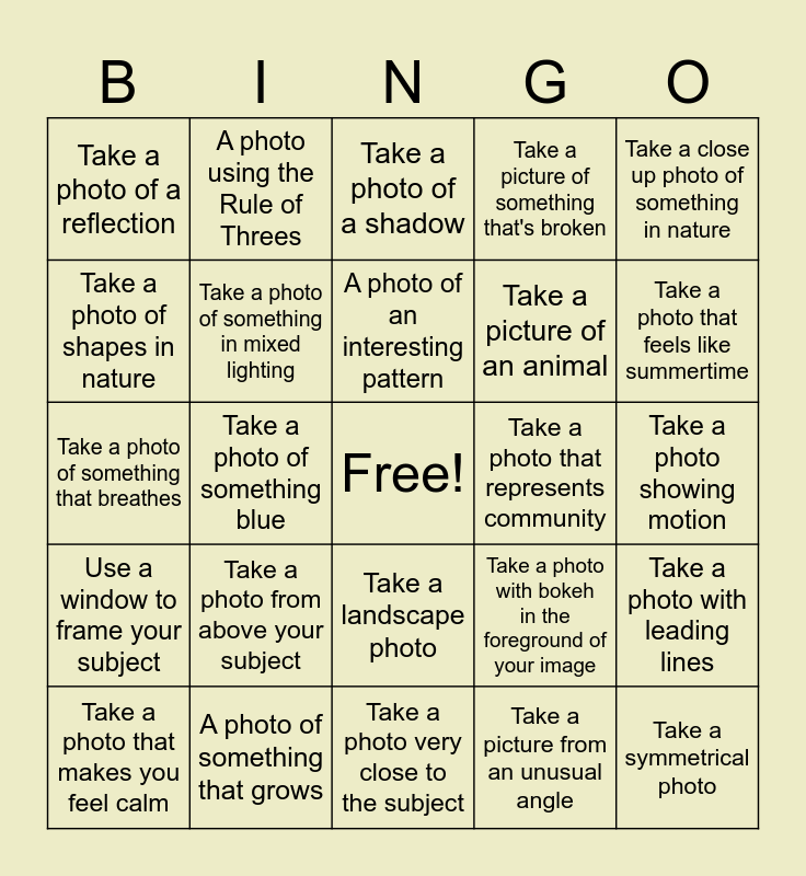 This bingo card has a free space and 24 words: Take a photo from above your subject, A photo of something that grows, A photo of an interesting pattern, Take a photo that makes you feel calm, Take a close up photo of something in nature, Take a photo of a reflection, Take a photo of shapes in nature, A photo using the Rule of Threes, Take a photo that represents community, Take a landscape photo, Take a picture of an animal, Take a photo of something that breathes, Take a photo with bokeh in the foreground of your image, Take a photo with leading lines, Take a photo of something in mixed lighting, Take a picture from an unusual angle, Take a photo showing motion, Take a photo of a shadow, Take a photo that feels like summertime, Take a photo of something blue, Take a symmetrical photo, Use a window to frame your subject, Take a picture of something that's broken and Take a photo very close to the subject.