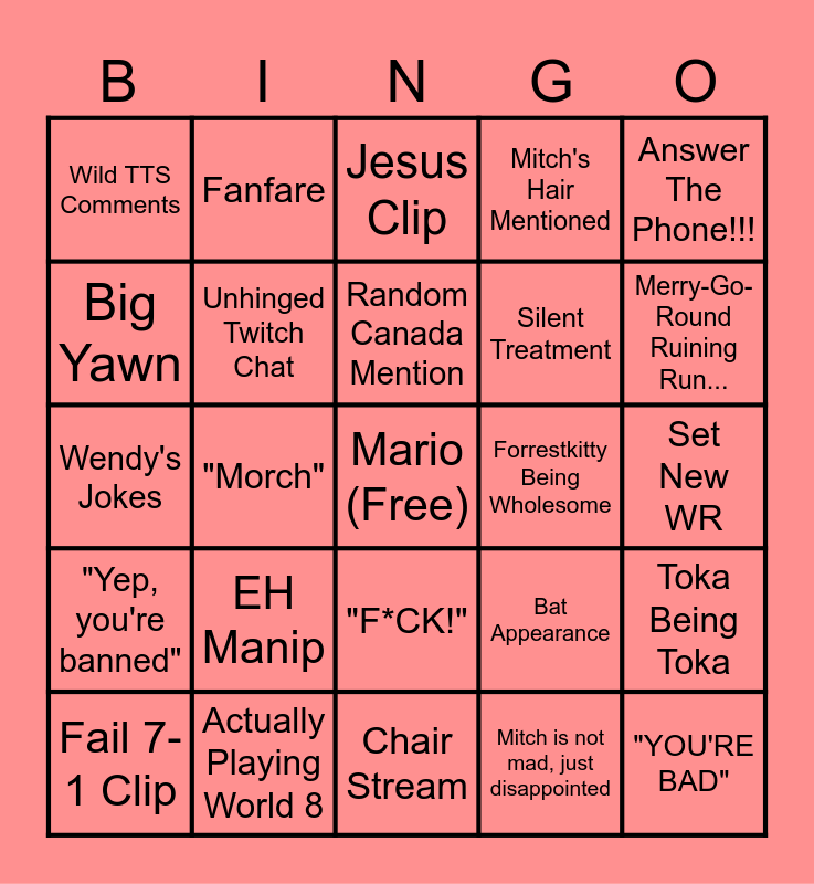 This bingo card has a free space and 24 words: EH Manip, Actually Playing World 8, Random Canada Mention, Fail 7-1 Clip, Answer The Phone!!!, Wild TTS Comments, Big Yawn, Fanfare, Forrestkitty Being Wholesome, "F*CK!", Silent Treatment, Wendy's Jokes, Bat Appearance, Toka Being Toka, Unhinged Twitch Chat, Mitch is not mad, just disappointed, Set New WR, Jesus Clip, Merry-Go-Round Ruining Run..., "Morch", "YOU'RE BAD", "Yep, you're banned", Mitch's Hair Mentioned and Chair Stream.