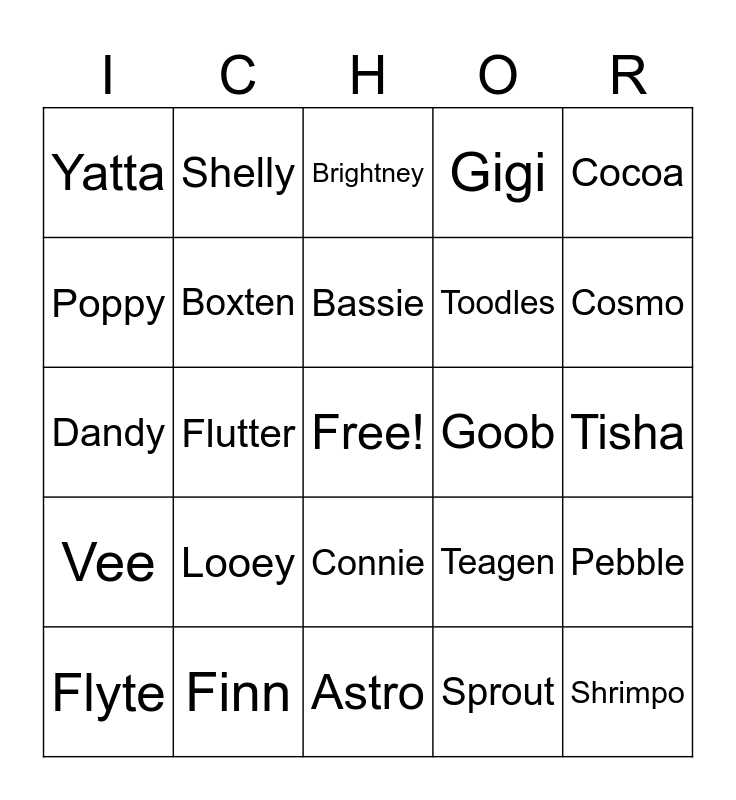 This bingo card has a free space and 24 words: Flyte, Looey, Bassie, Sprout, Cocoa, Yatta, Shelly, Brightney, Goob, Tisha, Dandy, Boxten, Teagen, Pebble, Poppy, Finn, Astro, Gigi, Cosmo, Vee, Flutter, Connie, Toodles and Shrimpo.
