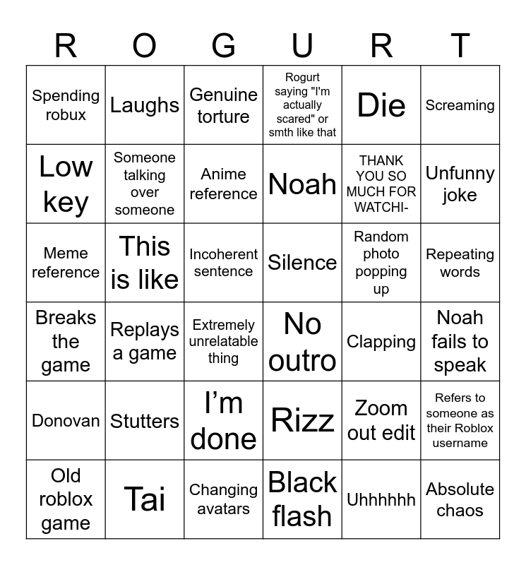 This bingo card has 66 words: Tai sucks at the game, Zoom out edit, Says 'editor', Replays a game, Stutters, Frank, Laughs, Solo video, Someone talking over someone, Weird noise, Repeating words, 'BOOM!', Incoherent sentence, Die, Backshots, Screaming, Unfunny joke, Spending robux, Slamming desk, Anime reference, Random photo popping up, Silence, Rogurt saying "I'm actually scared" or smth like that, Old roblox game, Short vid, Uhhhhhh, Changing avatars, Help, Meme reference, Completely irrelevant topic, Extremely unrelatable thing, I’m dead, Someone kills everyone, Rizz is aura farming, Breaks the game, No outro, Outro, THANK YOU SO MUCH FOR WATCHI-, Noah fails to speak, Absolute chaos, Low key, I’m done, This is like, Oh my god, Ronin dies first, Tai, Noah, Zane, Donovan, Rizz, Stoney, Whitt, Adrian, Eddy, Plenty, Refers to someone as their Roblox username, No way, Shoutout to, Genuine torture, Clapping, Black flash, Weird strict, Ragequit, Actually beats the game, Abuses glitches and Funny joke.